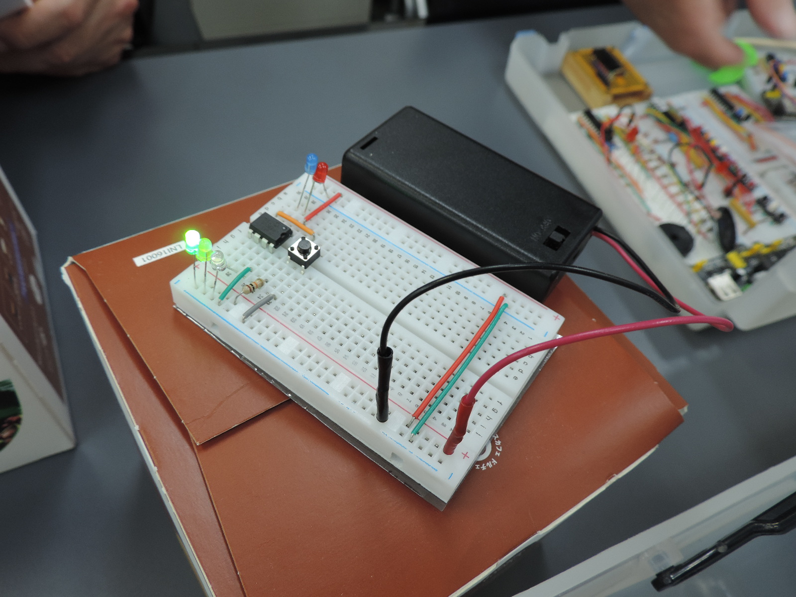 ※ 写真のLEDは抵抗内蔵タイプです。もし通常のLEDを使用する場合は330Ω程度の抵抗を直列に接続しましょう。
